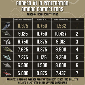 Rotational Cutting Action - The patented single bevel design increases penetration by rotating upon impact, cutting deeper through bone and tissue to create devastating wound channels.