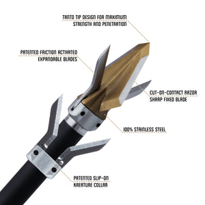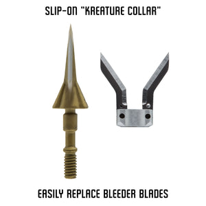 Kreature Collar Technology - Patent-pending Kreature Collar technology uses a simple friction snap blade locking mechanism without the need for extra unreliable parts such as plastic or rubber o-rings. In addition, the Kreature Collar technology allows you to quickly and easily replace your expandable blades in order to extend the lifetime of your broadheads.