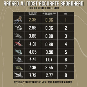 Unmatched Accuracy - Ranked #1 as the most accurate broadhead through independent testing, with a 0.06-inch shot variance at 60 yards, outperforming competitors by 26%.